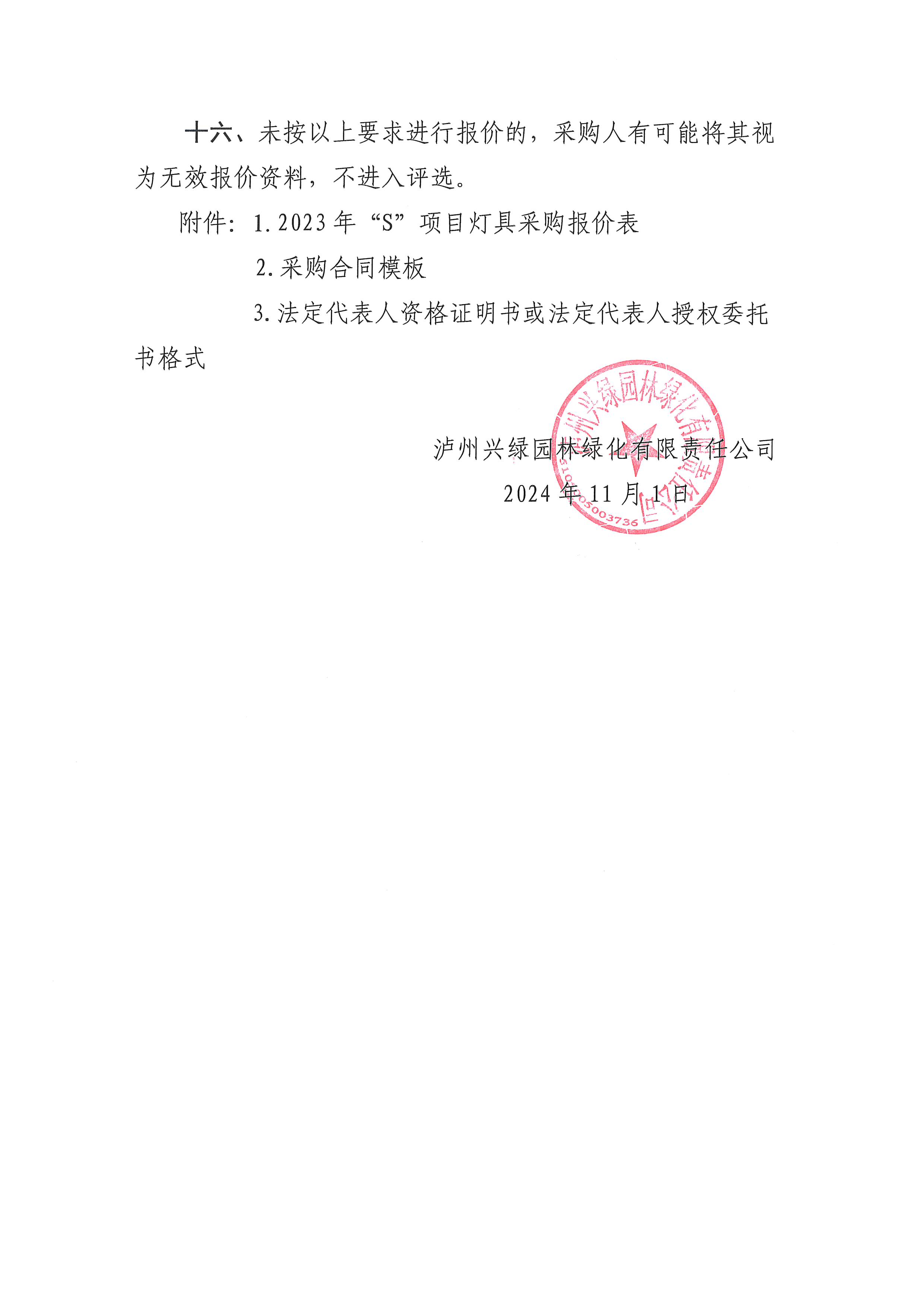 瀘州興綠園林綠化有限責(zé)任公司關(guān)于2023年“S”項(xiàng)目燈具采購(gòu)詢(xún)價(jià)公告